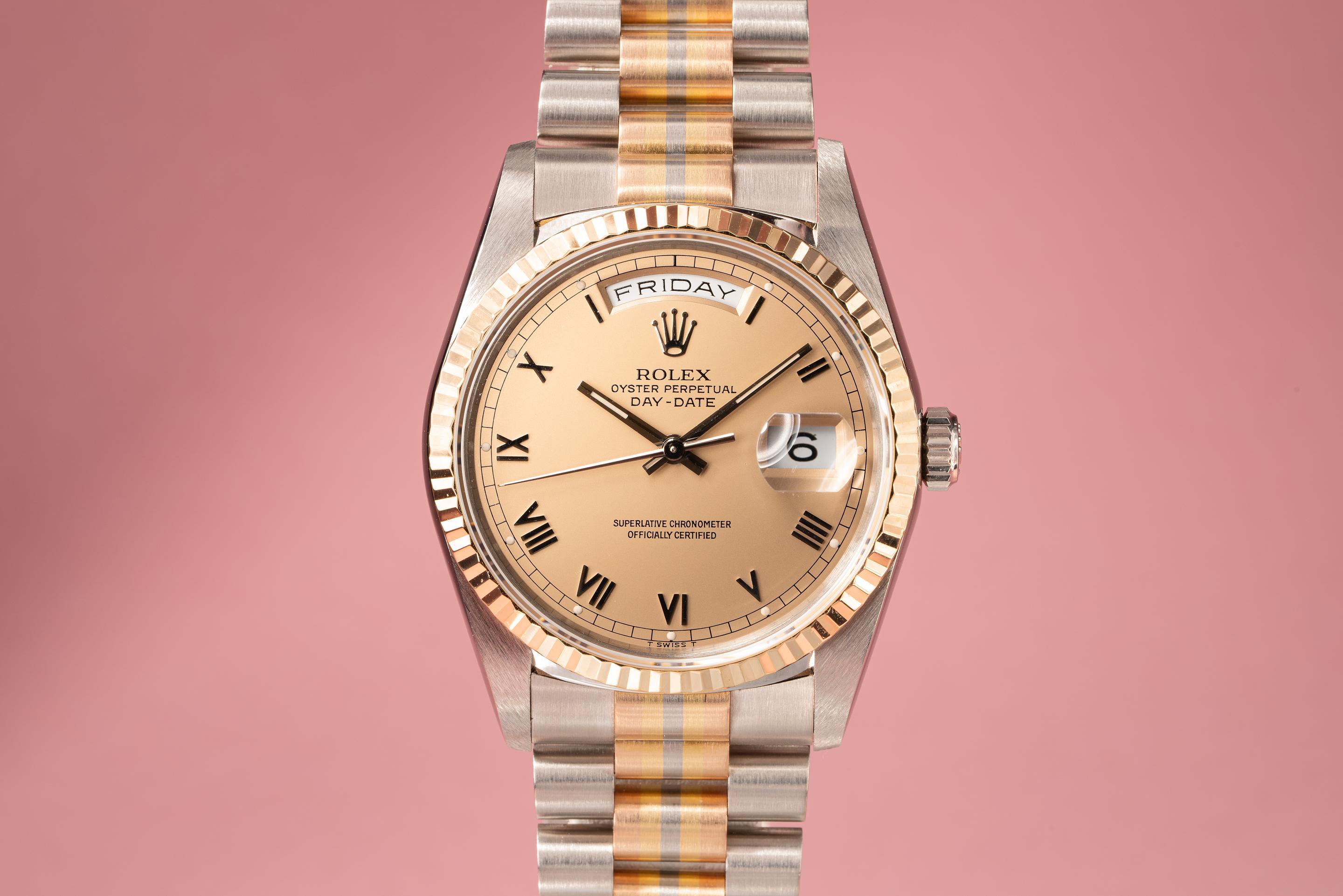 Chf 16'507 rolex daydate tridor, referenznummer 18239a bic; Rolex white gold president 36mm custom black roman dial on. Gold alone became boring, so to spice things up different types of gold were put together. Rolex white gold president 36mm custom dark pearl dial on. Rolex decided to clad a rainbow of rose, yellow and white gold right down main street (that's the center link) and they called this concoction "tridor". Back in the 1980s, a trend surfaced to match the new waves of wealth during the boom market. Rolex caliber 3055 as this particular tridor 18239 was part of the 18000 family of references, it was powered by the rolex caliber 3055 with the quickset date function, thus allowing both the day at the 12 o'clock position and the date window at 3 o'clock to be changed without manipulating the minute hand.